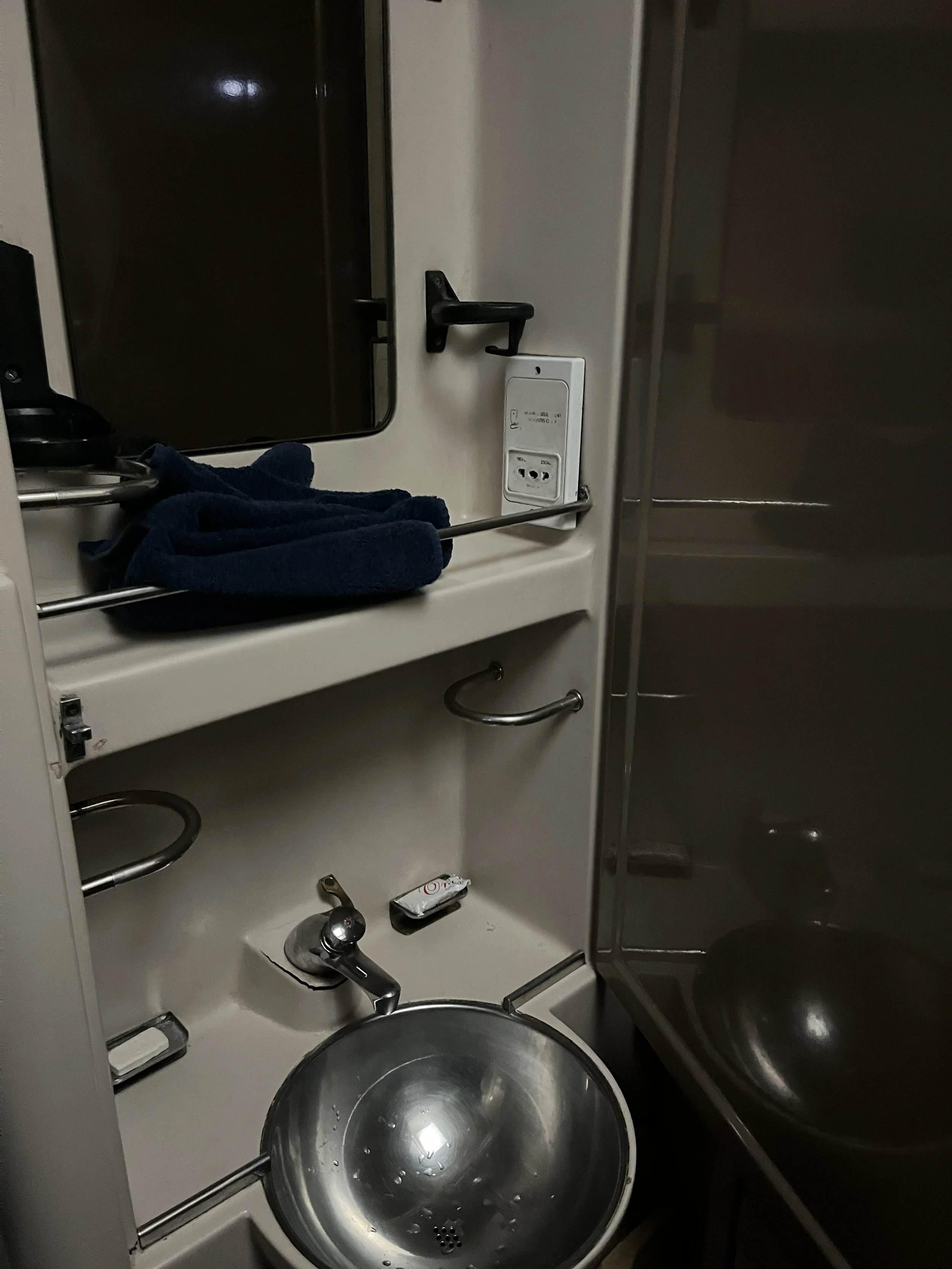 We woke early, around 5am, and at 5.15am the attendant knocked on the door with our breakfast trays. We asked him to convert the bottom bunk back into chairs so we could enjoy it which he did quickly for us. Breakfast consisted of lots of bread-based things which Tom couldn’t enjoy but there was also hard boiled eggs and some fruit. The attendant brought us a coffee which was included too.